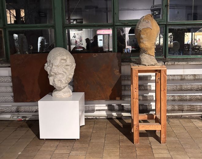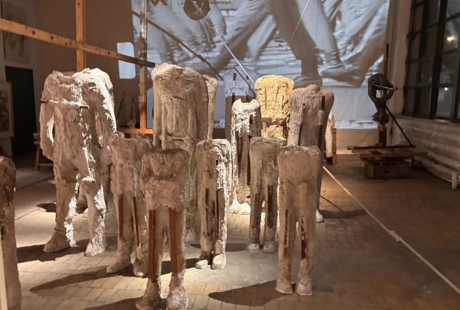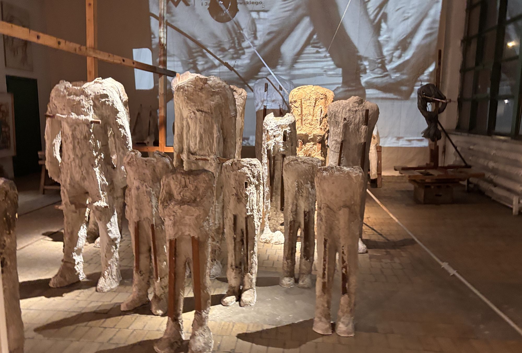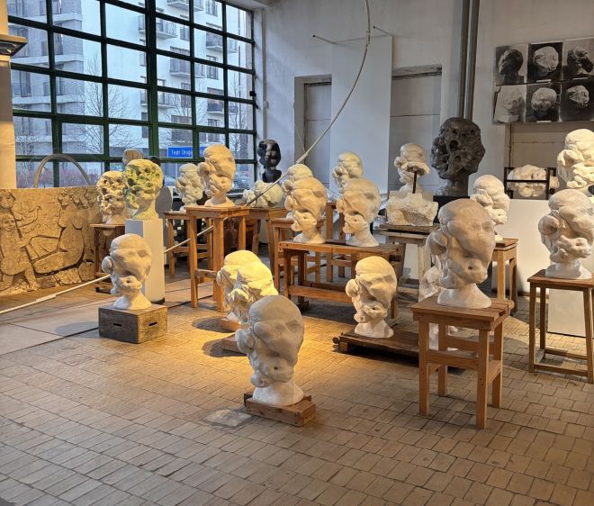 W głównej przestrzeni pracowni, która nosi ślady dawnego przeznaczenia tego budynku, a jedna ze ścian jest w całości przeszklona, prace Czełkowskiej i Abakanowicz stoją naprzeciw siebie. Czełkowską reprezentują tu głównie rzeźbiarskie głowy, ustawione na różnej wielkości drewnianych stołkach, stołach, kawaletach i białych postumentach, a czasem – niemal wprost na surowej podłodze. Nie są to jednak po prostu głowy. To głowy zdeformowane, pozbawione twarzy, oczu, zjedzone naroślami, chorobą, a może jeszcze nie w pełni uformowane. Wiele z nich to odlewy z tej samej formy.