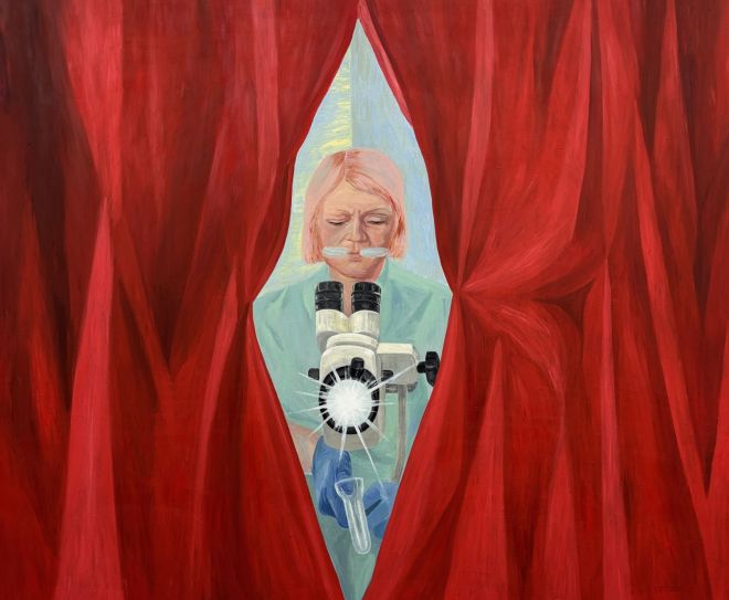 Zmienia się tylko perspektywa. Czasami spoglądamy na lekarza spomiędzy naszych ud. Obraz „Badanie” został namalowany tak, jakbyśmy patrzyli z wnętrza ciała kobiety. Wargi sromowe rozsuwają się niczym czerwona, aksamitna kurtyna, odsłaniając widok gabinetu z lekarką trzymającą w dłoniach wziernik i zerkającą w okular specjalnego urządzenia. Obiektyw urządzenia skierowany jest w naszą stronę, czyli do środka ciała. To niespotykana dotychczas w malarstwie gra spojrzeń. Zazwyczaj jednak obserwujemy sytuację z boku, jako intruzi, podglądacze i podglądaczki, jakbyśmy sami dokładali się do dyskomfortu półnagiej pacjentki.