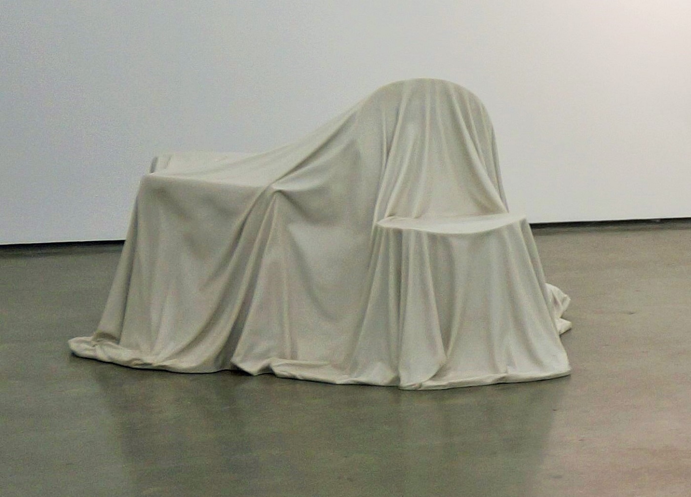 Moją uwagę przyciągały jednak głównie rzeźby z syntetycznego marmuru, na pierwszy rzut oka wyglądające jak meble okryte białymi prześcieradłami. Dopiero z bliska okazuje się, że to trwalszy materiał. W marmurze Gander odtworzył kryjówki, które miała w zwyczaju robić jego córeczka. Elegancja tych rzeźb miesza się z pierwotną potrzebą bezpieczeństwa, schronienia, własnego miejsca.