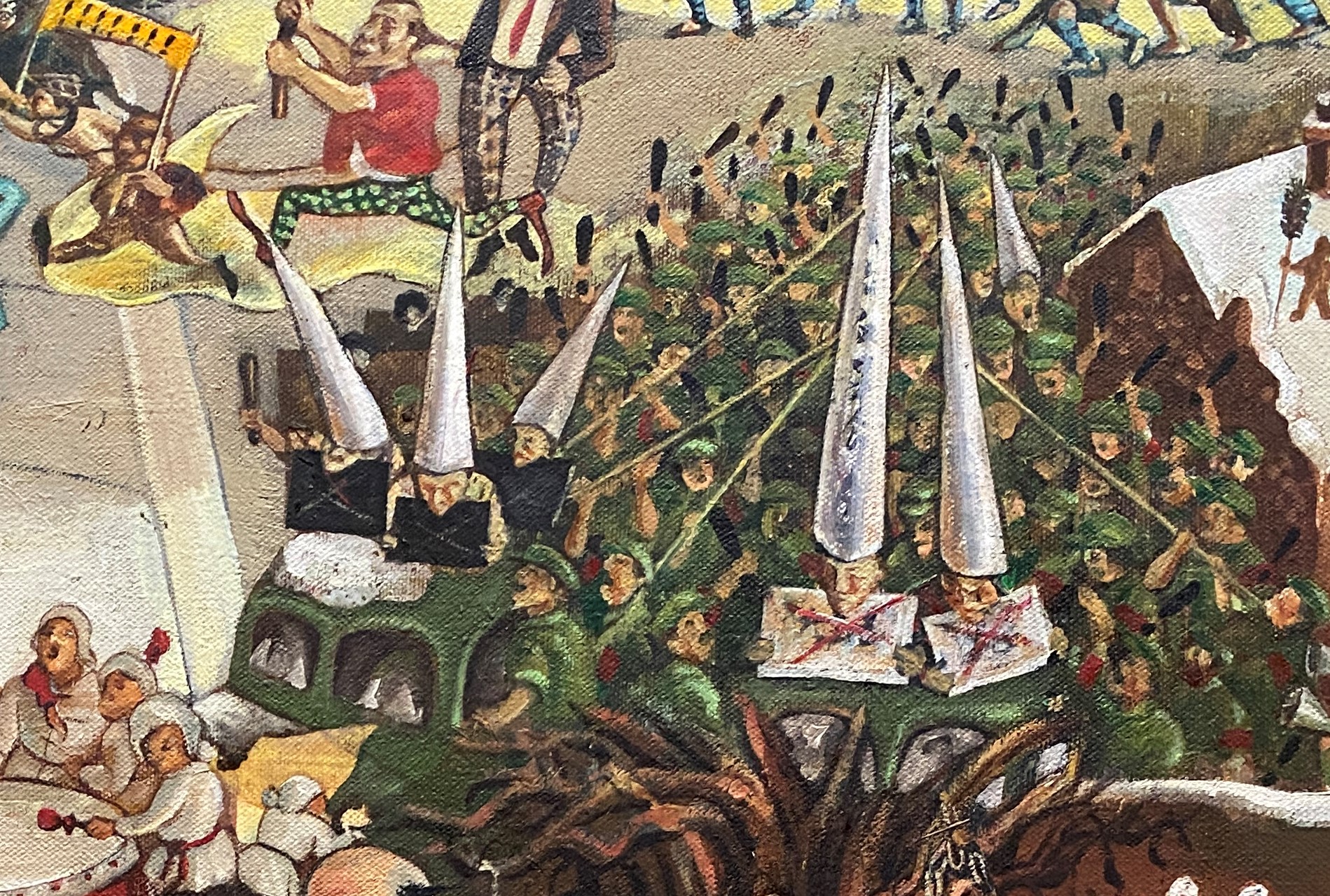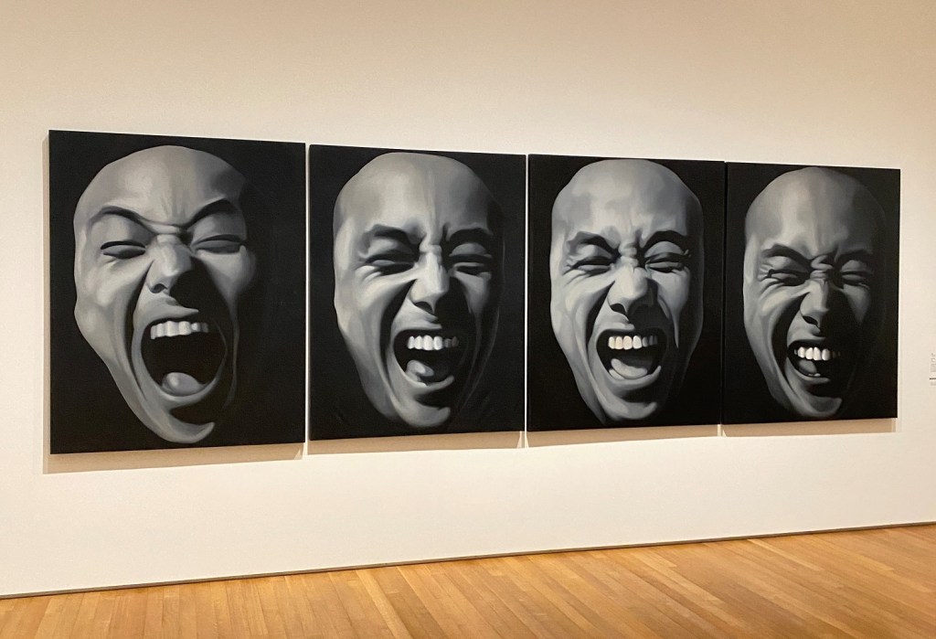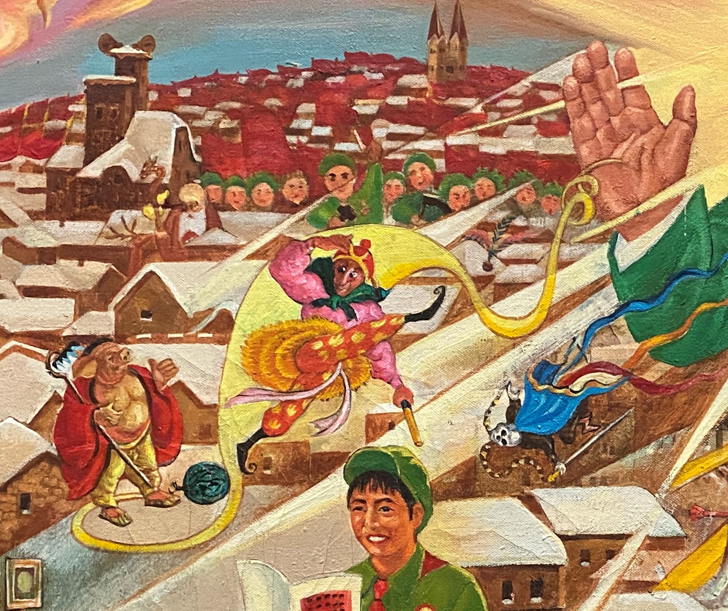W obrazach, które wiszą na ścianach fikcyjnej – jak mi się wydaje – pracowni, można rozpoznać konkretne dzieła artystów, z którymi Ma współtworzył grupę Gwiazdy. W górnym lewym rogu widać obraz „Yuanmingyuan: Odrodzenie” Huang Ruia (który również trafił do kolekcji Sigga i jest obecnie wystawiany w M+).