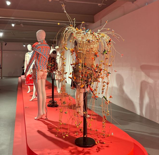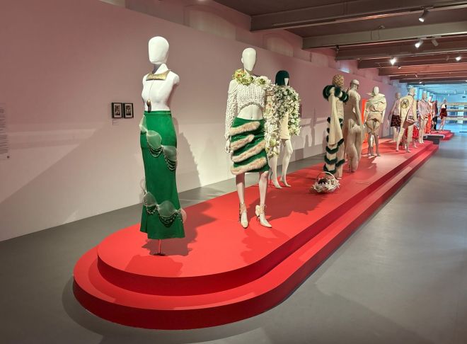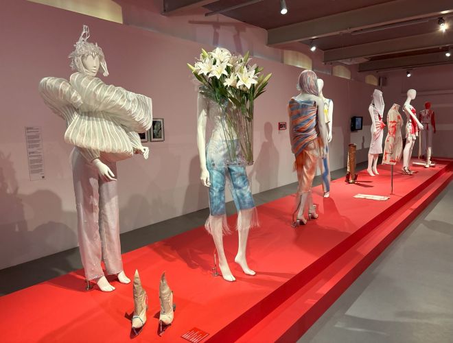 Nawet jeśli niektóre kolekcje były bliższe prêt-à-porter, zawsze pojawiało się na nich coś odlotowego. To te projekty robią największe wrażenie na łódzkiej wystawie. Jak efektowna spódnica z krynoliną odwrócona w drugą stronę, do góry, tak, że nosząca ją kobieta staje się kwiatem czy pawiem, który właśnie otworzył wachlarz swojego ogona. Wrażenie robi też przezroczysty plastikowy top, będący jednocześnie wazonem na białe lilie, które modelka podczas pokazu rozrzucała wokół. Są tu sukienki z krwawiącymi gołębiami, stroje dla bliźniaczek syjamskich i marynarki z kwiatów.