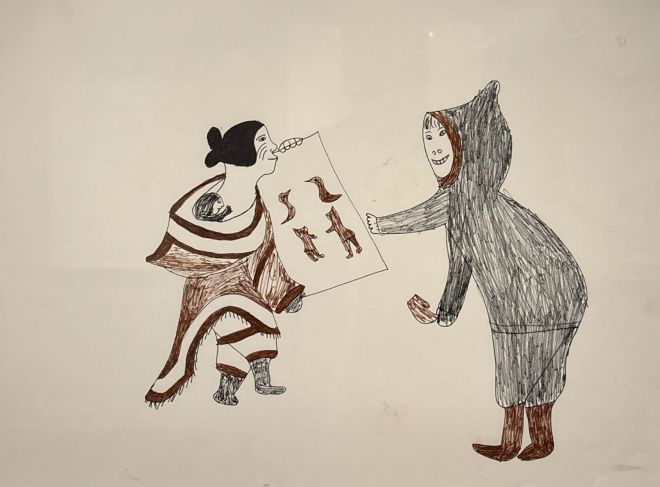 Pytanie, które kuratorka Emily Laurent Henderson zadała rysunkom ze zbioru w McMichael brzmiało: „Jakie opowieści z tych prac nigdy nie trafiły na rynek?”. Tu pojawiał się jeden z wielu paradoksów dotyczących relacji Kanady z jej rdzennymi mieszkańcami: w tym samym czasie, w którym władze zmuszały Inuitów do zmiany trybu życia, porzucenia nomadyzmu na rzecz stałych osad, modernizacji, od ich sztuki oczekiwano, że będzie opowiadać o życiu „sprzed kontaktu”, to znaczy sprzed kontaktu z Białymi, qallunaat.