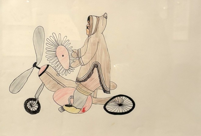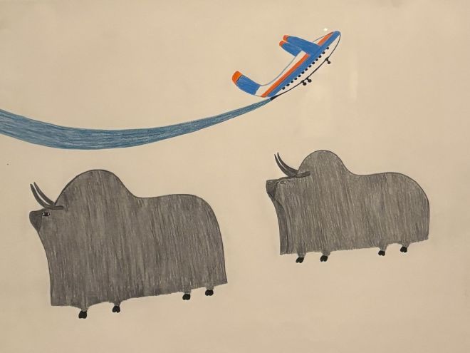 Tych przemian raczej nie widać w grafikach z Kinngait, poza samym faktem, że te grafiki w ogóle powstawały. Odcisnęły się jednak na swobodniejszej twórczości rysunkowej. Dlatego Henderson nazywa je dokumentem społecznym. Na wystawie w McMichaels można zobaczyć inuickich mężczyzn tańczących do płyt gramofonowych czy samoloty, które stały się głównym środkiem transportu w Arktyce. Są tu nowego typu budynki, osady, ale także całe fantastyczne miasta, wyobrażenia o miastach południa, ale też. Wreszcie dają o sobie znać napięcia kulturowe, spotkania z qallunaat.