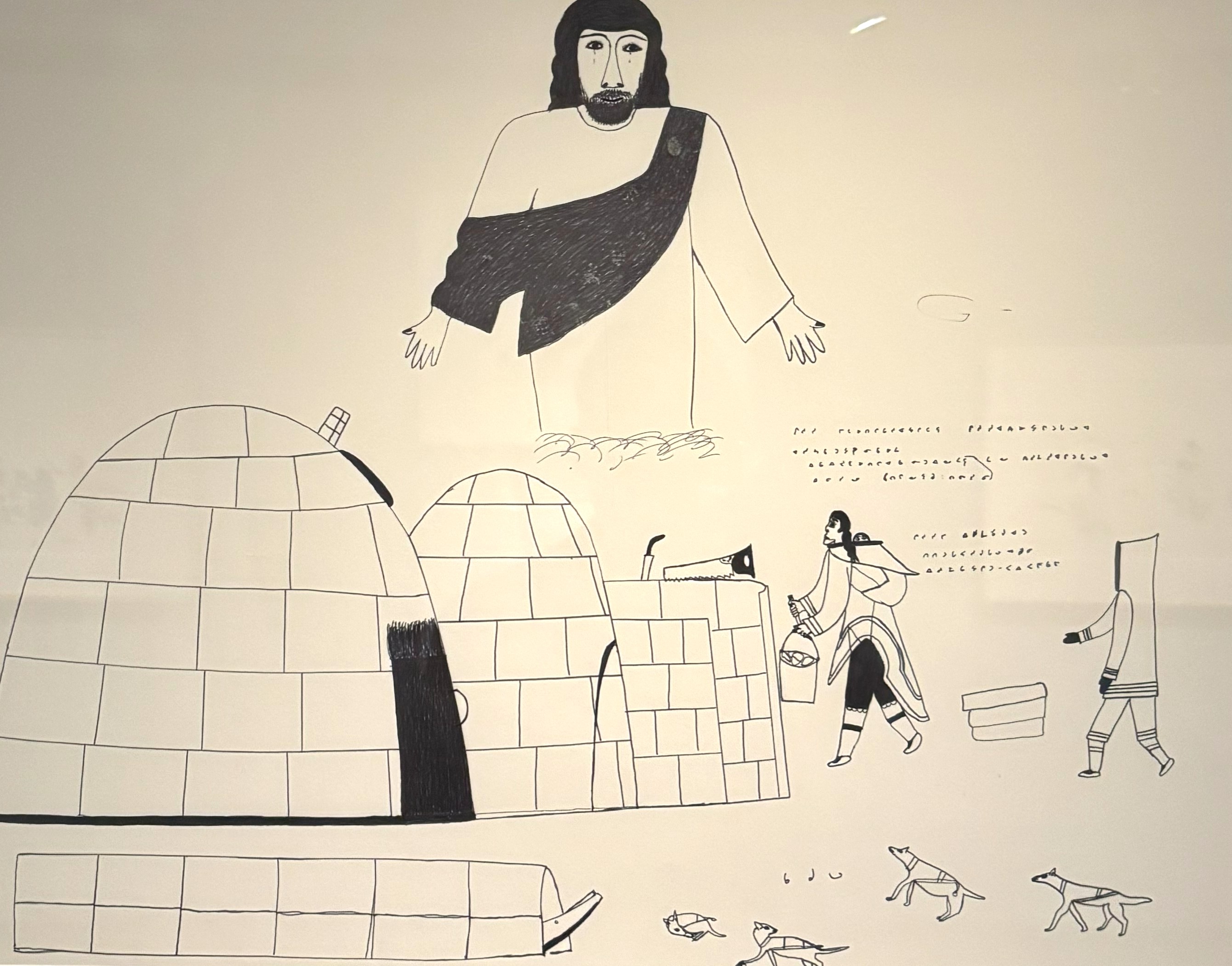 Kananiginak Pootoogook zilustrował rosnącą popularność chrześcijaństwa (w wyniku intensywnych misji chrystianizacyjnych i działalności szkół rezydencyjnych): na jednym z rysunków pokazał chrzest w igloo, na innym – Jezusa błogosławiącego klęczącego mężczyznę. Jezus jest ubrany w swoje tradycyjne szaty, Inuita – w tradycyjny strój ze skóry. Chrześcijaństwo w wydaniu inuickim wydaje się nieortodoksyjne. Inuksuk zamienia się w krzyż, a Jezus nosi na ramionach psa zaprzęgowego zamiast baranka.