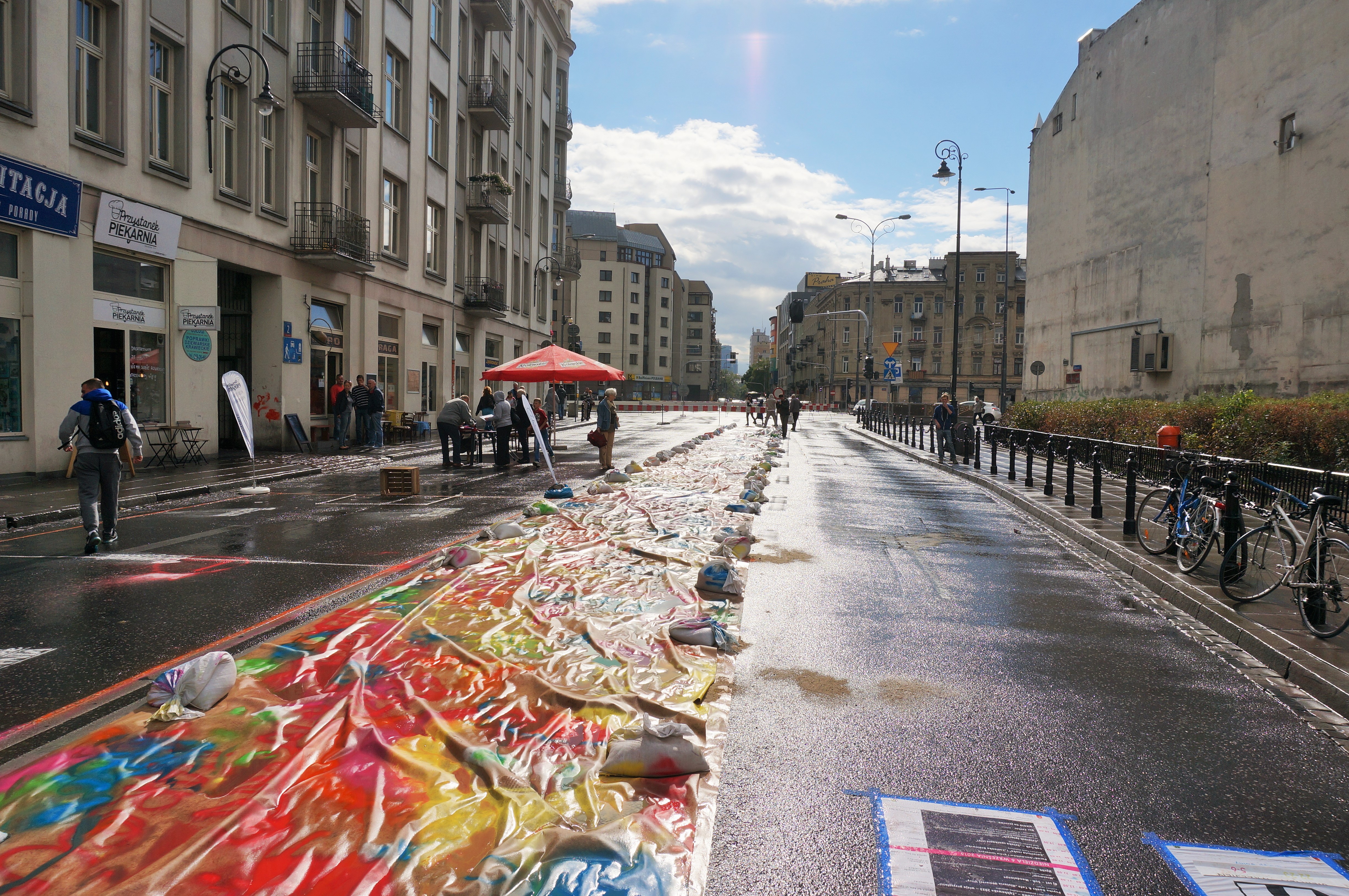 Przez dwa dni festiwalu Otwarta Ząbkowska trwał też kongres rysowników (pod hasłem „Świetlista rzeka”), adresowany głównie do praskich dzieci. Rysowały na długich pasach papieru, położonego bezpośrednio na ulicy. Dorośli chętniej wypisywali hasła – o Legii albo o tym, że lokatorzy to nie towar. Ale zauważyłem też brzmiące znajomo „3 razy da”, wszak w niedzielę odbywało się tłumnie bojkotowane referendum. Rysunki spektakularnie rozmył krótki, ale intensywny deszcz.