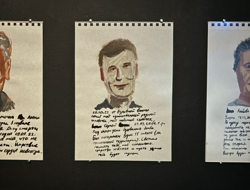 Denys Pankratov zapisywał swe myśli na pudełkach od zapałek. W tym czasie, w pierwszym roku pełnoskalowej wojny, jako mieszkaniec zachodniej Ukrainy, zaangażował cały swój czas w pomoc osobom uchodźczym. Słowa notowane przez Pankratova to na przykład „alarm”, „głodogodziny”, „mogiła”. Lesia Khomenko maluje na podstawie zdjęć wysyłanych z frontu przez jej męża Maxa Robotova. Dwa obrazy na „To tylko wystawie”, „Siedzący olbrzym” i „Stojący olbrzym” (oba 2023), opowiadają o przerwach w dostawach prądu na froncie.