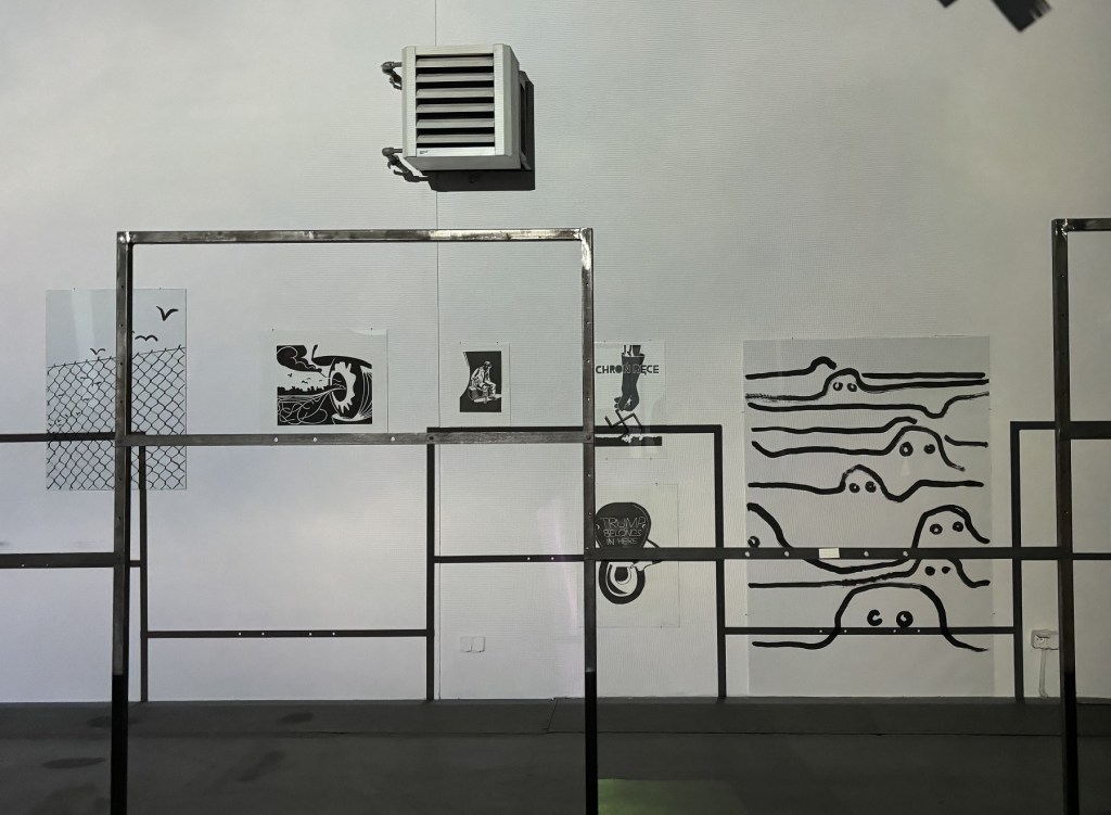 Artyści ukraińscy biorący udział w wystawie walczą w ukraińskiej armii lub – w kilku przypadkach – są już weteranami obecnej wojny. Ich prace znalazły się w centrum wystawy. Polscy artyści zajęli pozycje na marginesie sali, ich prace oddzielone są od widzów rodzajem metalowego stelaża czy płotu, a na ściany i same dzieła sztuki rzutowane jest wideo przedstawiające spokojne niebo nad Lublinem. Tę instalację, zbudowaną z odzyskanych elementów wcześniejszych wystaw w Labiryncie, zbudował sam kurator i dyrektor galerii Waldemar Tatarczuk. Zależało mu na tym, by prace polskich artystów pochodziły z ostatnich dwóch lat, czyli z okresu, gdy na Ukrainie toczyła się już pełnoskalowa wojna.